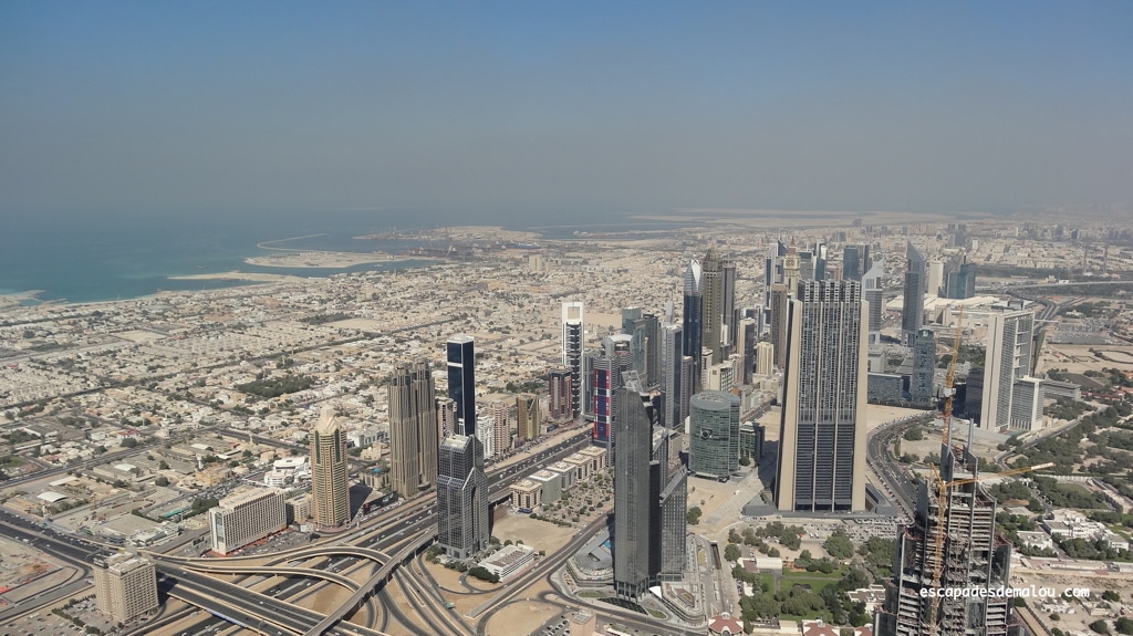 Les grattes ciel et au loin le golfe Persique