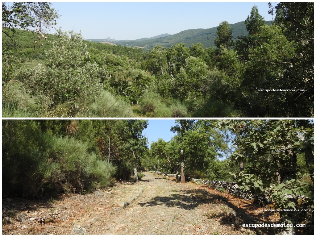 Il faut suivre le balisage rouge et jaune, en longeant un petit bout de route. Ensuite le parcours continu à gauche sur l’ancienne voie romaine. La montée assez raide d’environ 2 kilomètres est un peu ombragée, heureusement !