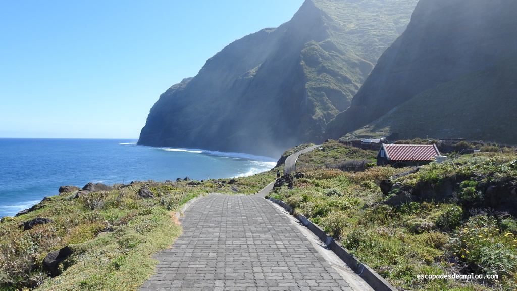 Le téléphérique d’Achadas da Cruz à flanc de falaise offre une vue fantastique sur les versants surplombant l’océan. La descente presque verticale est vertigineuse et l’arrivée impressionnante ! Dénivelé : 434 mètres.